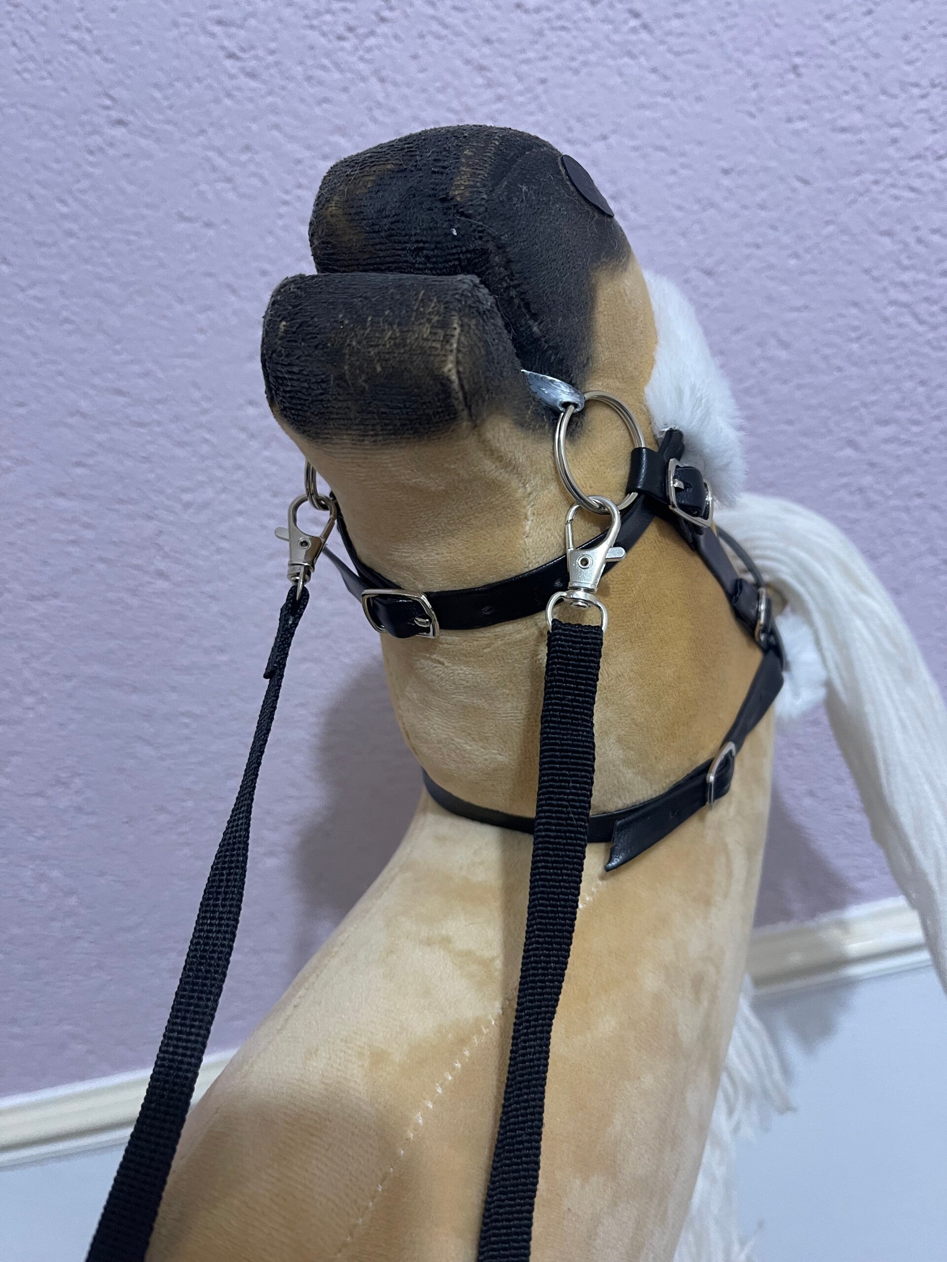 IW fur bridle with white fluffy fur and black reins.